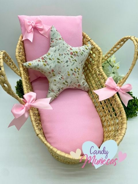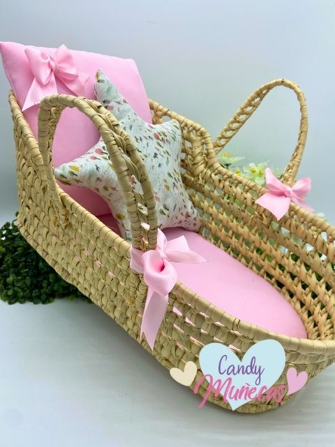 Capazo moises de palma para muñecas rosa naturaleza hecho a mano