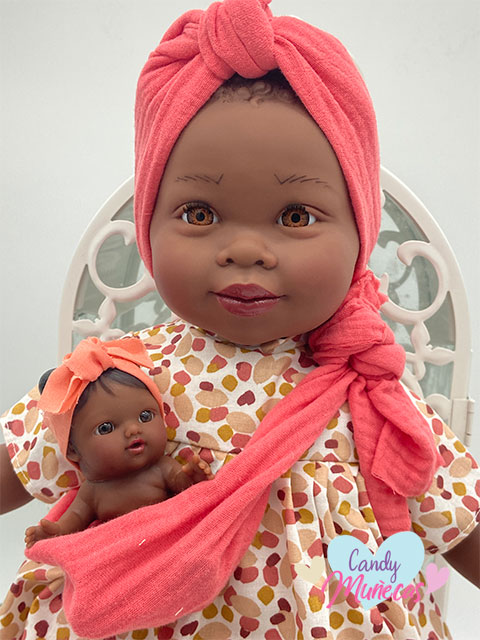 Preciosa muñeca de color con el cuerpo blandito. Te enamorará con su bebé en el pañuelo.