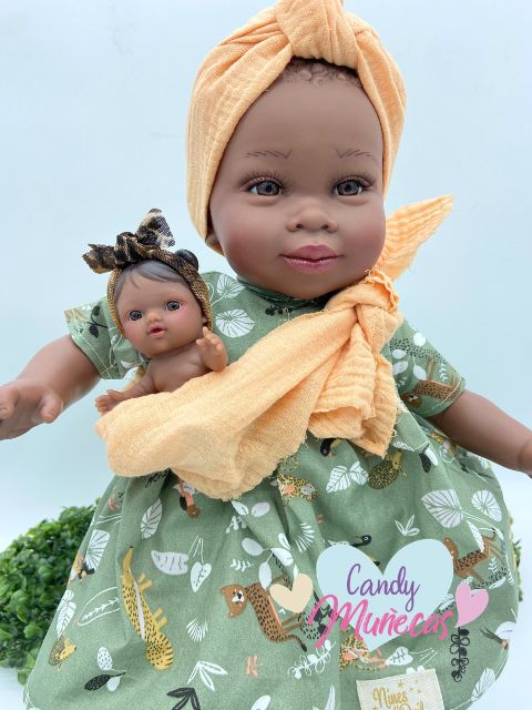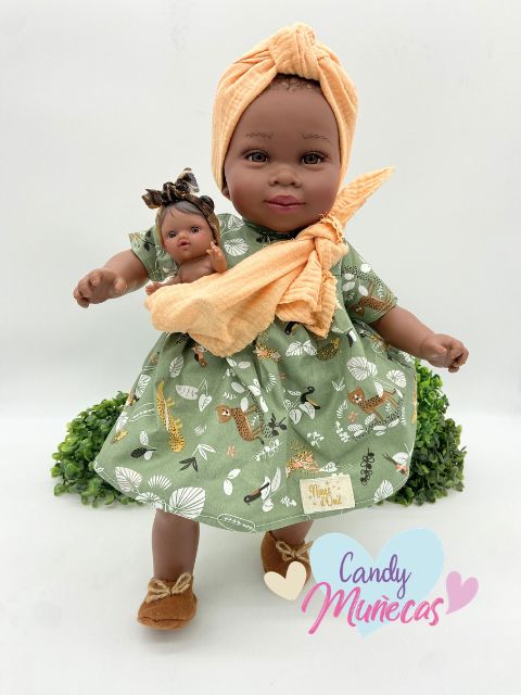 Uno de sus rasgos más característicos es que incluye un bebé que puede llevar en el pañuelo, tal como se muestra en la imagen, recreando una forma tradicional de porteo. Este detalle añade valor educativo y permite desarrollar historias llenas de cariño y creatividad.